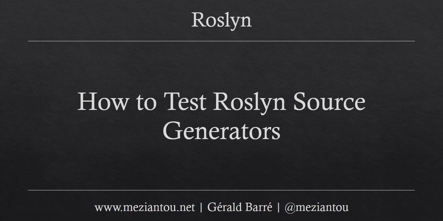 How to Test Roslyn Source Generators | https://www.meziantou.net/how-to-test-roslyn-source-generators.htm When developing a Roslyn Source Generator, it's important to verify that it works as intended. There are several approaches to testing: you can compare the generated code output (for example, with sna... |